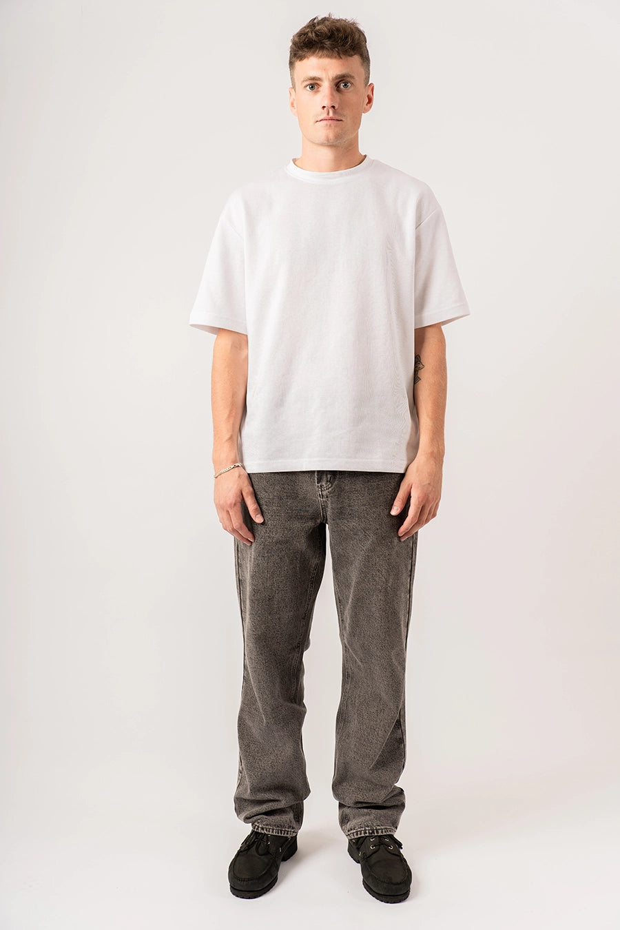This model is our take on the perfect baggy jeans. The model is available in 3 washes: Black, Gray & Retro Blue. The model has internal elastics so that it can be tightened around the waist.